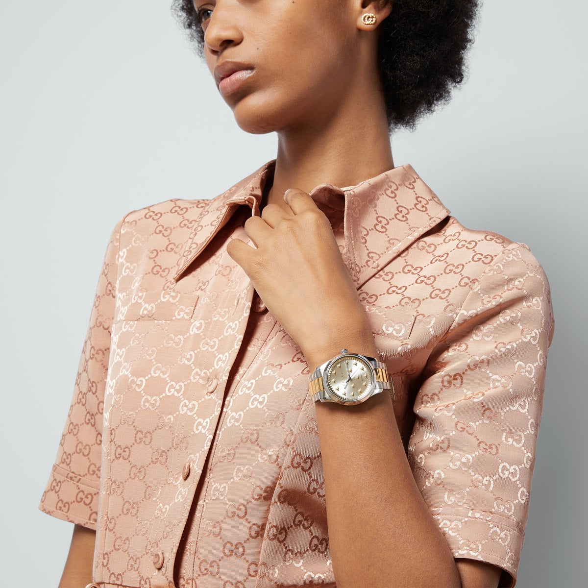 The Gucci G-Timeless Multibee 32mm Gold Dial Quartz Ladies Watch is a feminine and elegant timepiece that is perfect for everyday wear. Its 32mm stainless steel case is complemented by a sun brushed gold dial and a matching bracelet. The dial features delicate bee motifs, a nod to Gucci's iconic symbol. Powered by a Swiss quartz movement, this watch is both reliable and stylish.