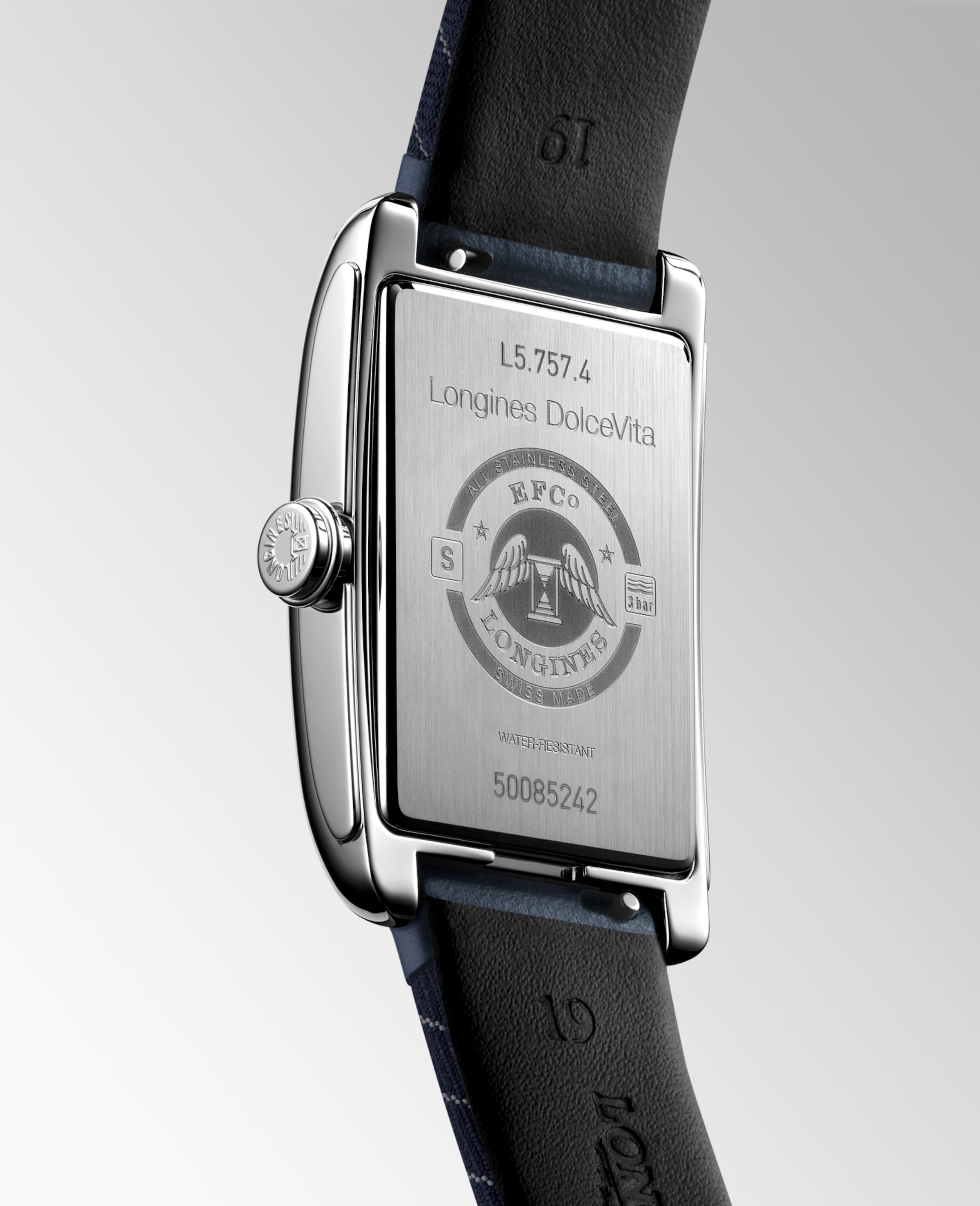 The Longines DolceVita 43mm Silver Automatic Women's Watch exudes timeless elegance and sophistication. Its polished silver dial, adorned with sleek Roman numeral hour markers and blued steel hands, creates a refined and classic aesthetic. The rectangular stainless steel case, complemented by a luxurious leather strap, adds to its charm and wearability for any occasion.