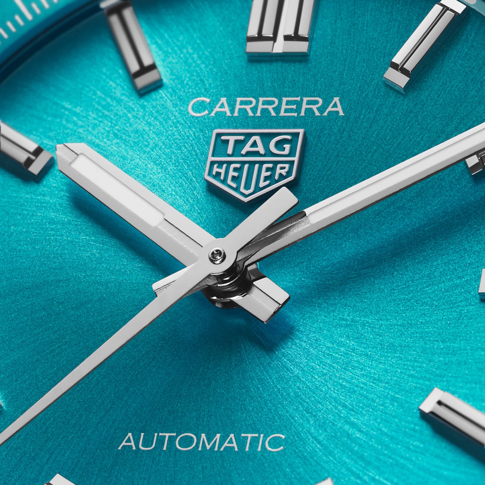 Introducing the TAG Heuer Carrera Date in 36 mm, a stunning timepiece featuring a turquoise blue snail brushed dial and a robust steel case. Designed for elegance and precision, it offers a striking blend of style and functionality.
